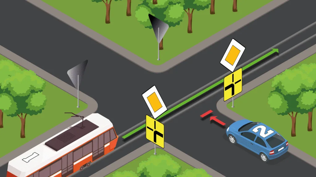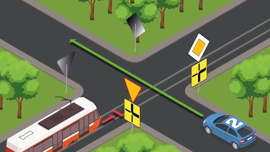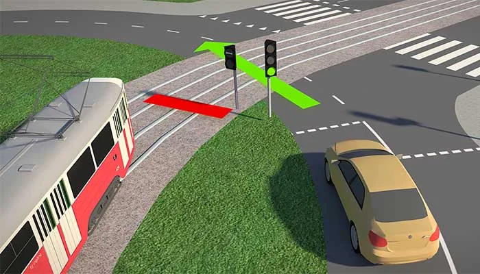 Podczas skrętu w lewo kierowca musi ustąpić tramwajowi nadjeżdżającemu z naprzeciwka, tak samo jak innym pojazdom jadącym na wprost.