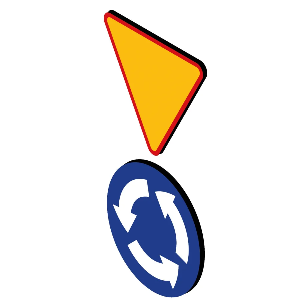 Gdy ruch na rondzie jest oznakowany znakami „ustąp pierwszeństwa” (A-7) i „ruch okrężny” (C-12)