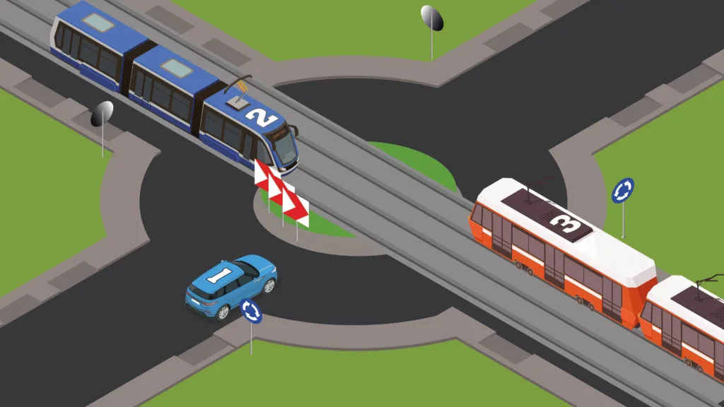 - czyli tramwaj wjeżdżający na rondo musi ustąpić pierwszeństwa pojazdom, które już się po nim poruszają.